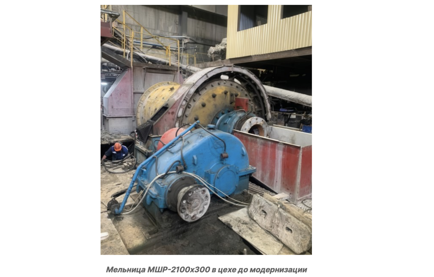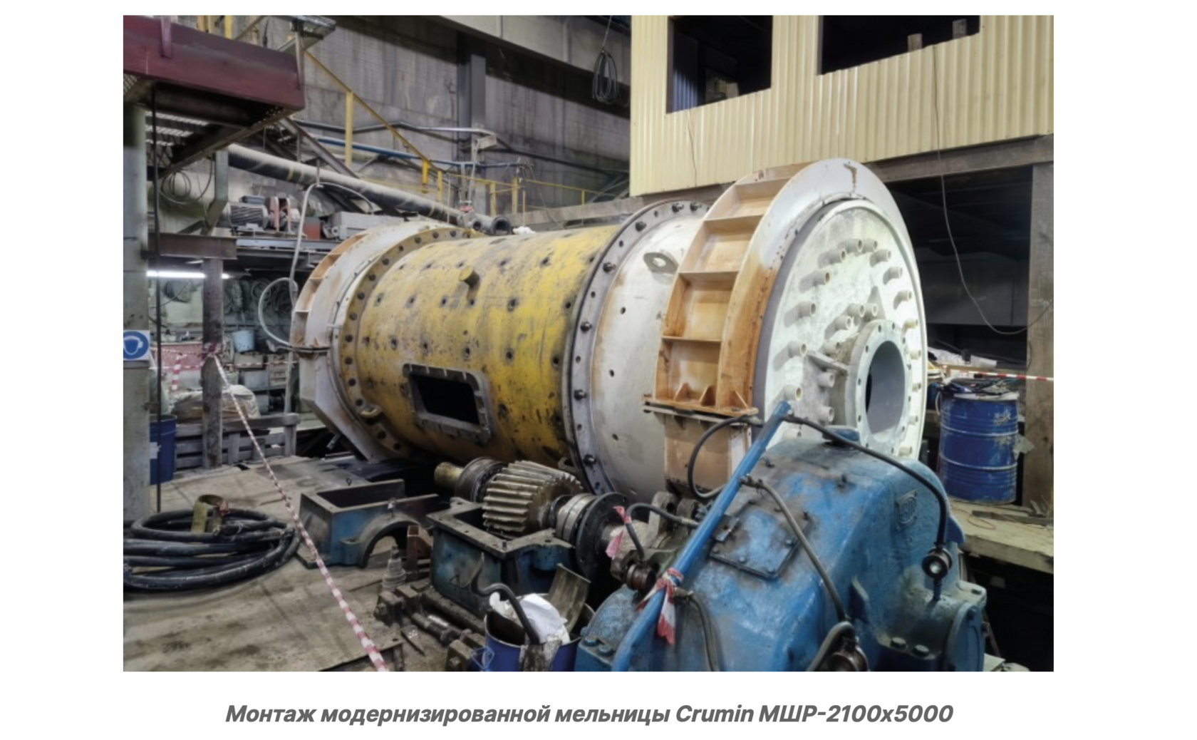 Модернизированная мельница Crumin МШР-2100х3000 вместо крышек с цапфами оснащена загрузочной и разгрузочной царгами с бандажами, которые опираются на сегментные подшипники. Вместо демонтированных подшипников с одним вкладышем и фундаментных плит были установлены новые фундаментные плиты с сегментными подшипниками. При этом сохранена исходная сетка фундаментных болтов, а сами болты были укорочены.